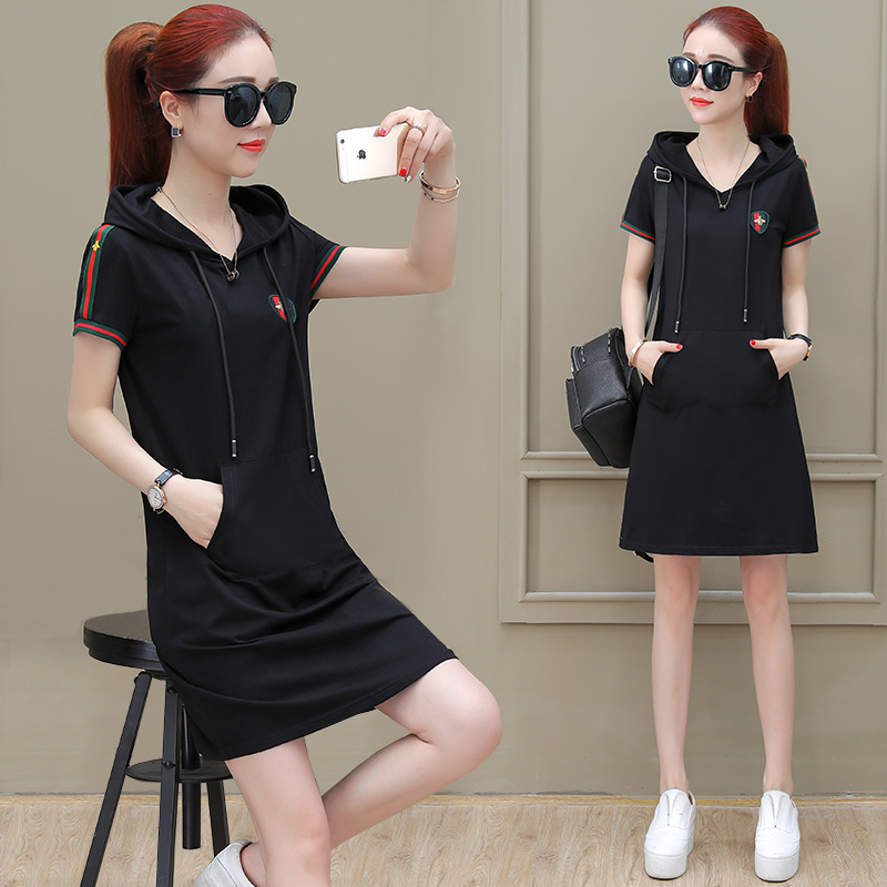 短袖卫衣中长款女夏韩版2018新款连帽运动休闲宽松连衣裙修身...